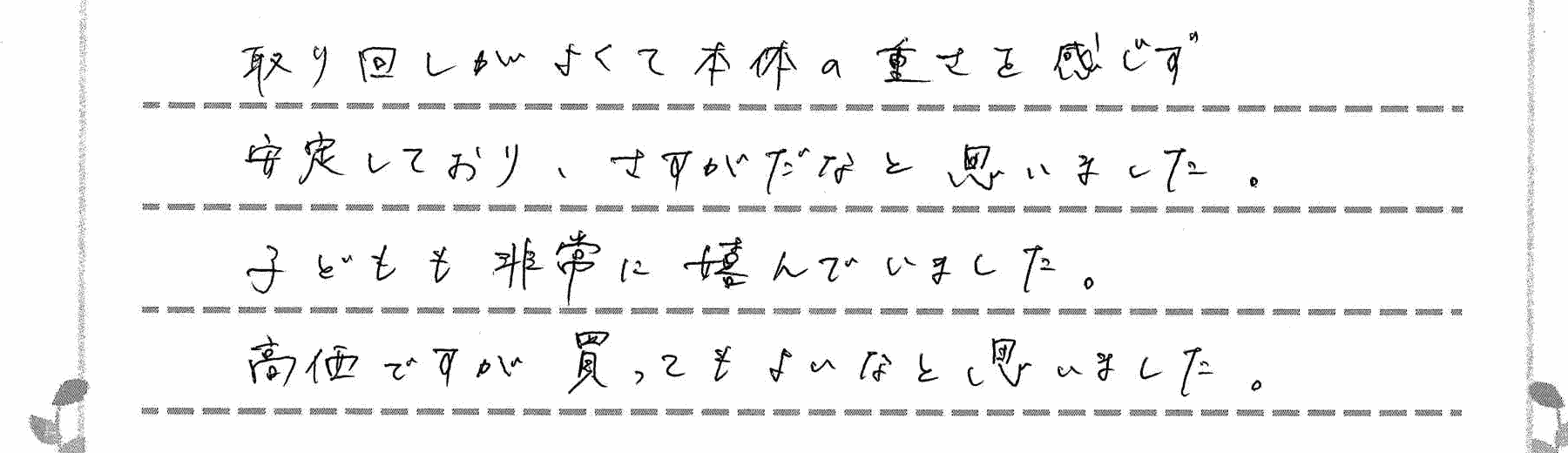 取り回しがよくて本体の重さを感じず安定しており、さすがだなと思いました。子どもも非常に嬉んでいました。高価ですが買ってもよいなと思いました。
