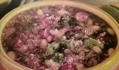 (3)温度を高温に設定し、マカロニとパルメザンチーズを入れる。15分から30分煮込み、刻んだパセリを乗せる