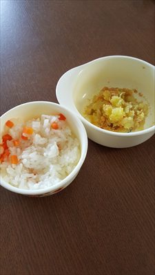 →冷凍ストックしていた軟飯と角切りの人参・大根を一緒に耐熱容器に入れて水を少し加えてレンジでクルクル。