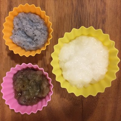 ごはん大さじ1に対して水大さじ6を鍋に入れて、20分焚き、15分蒸らし、すり鉢ですりつぶします。