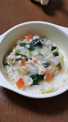 茹でた鶏ひき肉・解凍した野菜類・水を鍋に入れ、火にかけふつふつしてきたら少量の味噌を加えて味を整える。ご飯の上にかけて完成。