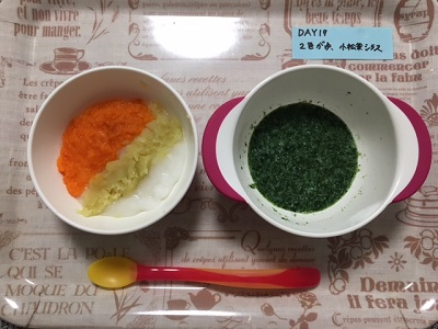 まだ離乳食初期とはいえ見た目が殺風景だな~と思い、この日は2色がゆにしてみました!10倍がゆににんじんペーストとさつまいもペーストをのせただけです^^