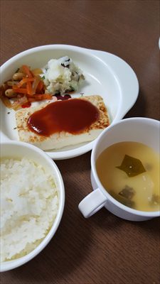 →木綿豆腐の水気を切り、厚さを半分にして片栗粉をつける。油を熱したフライパンで焦げ目が付くまで焼く。耐熱容器にケチャップ・ソース・砂糖を入れてレンジでクルクルし、たれを作る。焼けた豆腐ステーキにたれをかけて完成。