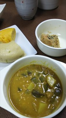 ➡角切りにしたじゃがいも・なす・きゅうりとひき肉を炒め、肉の色が変わってきたら水を加えて煮る。沸騰したらあくを取って、野菜が柔らかくなるまで煮て、カレールーを加え、トロミがつくまで煮込んだら完成。
