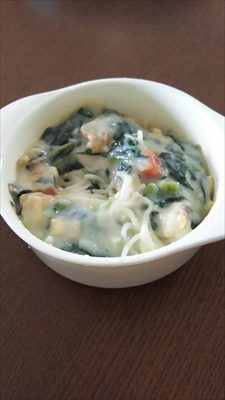 手作りミックスベジタブル(人参・なす・キャベツを角切りにして蒸して冷凍したもの)を解凍し、油を熱したフライパンで食べやすい大きさに切った小松菜と一緒に炒める。炒り卵・コンソメを加えて軽く炒めたら、豆乳を加えて煮る。