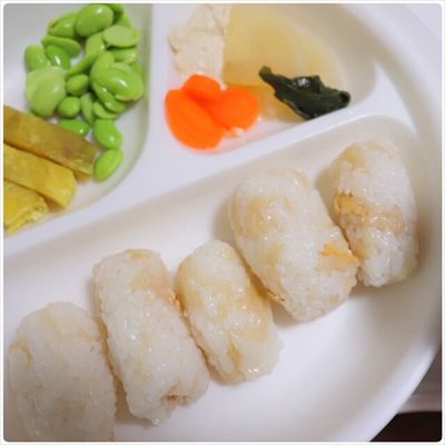 そのままでは食べてくれないので、ご飯に混ぜておにぎり型にしてあげました。