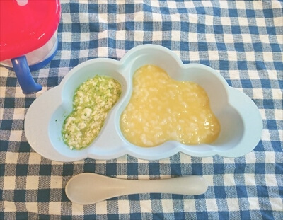 クタクタだったので、お粥だけ炊いてあとはフリーズドライのお魚(鱈)と瓶のベビーフードのおかずで済ませてしまいました。