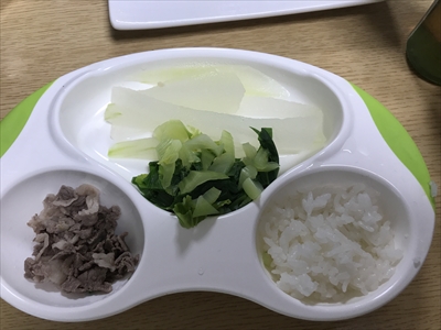 2つあるコンロの1つを親用フライパンで炒めつつ、もう一つのコンロにお鍋を置いて、お湯をはり、同じ具材をユウくん用に茹でました。