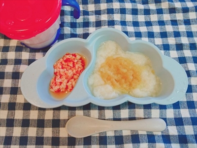 すりおろしたリンゴをレンジで10秒ほど加熱し、パン粥に乗せたら出来上がりです。