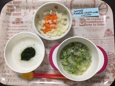 今日は朝6時くらいからキャッキャし始めたので、いつもはしない朝いちの授乳をしました。なので朝ごはんは残すかなと思いましたが、意外に完食でした。最近おかゆやトロトロお野菜をあげ続けていると、食感に飽きて怒ってくるので、ちょっと飽きてきた感じがあったら角切りお野菜をあげるようにしています。今のところ、にんじんポテトかにんじんだいこんくらいしかレパートリーがないので、もっとメニューを増やしていかねばです。