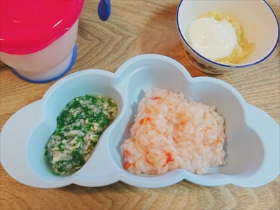 今日は途中でグズグズしてしまい、抱っこしてお膝の上で完食しました。