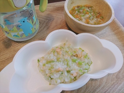 シチューの具材は鮭、シメジ、人参、キャベツです。離乳食用のクリームソースの素を使いました。