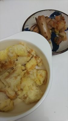 ➡カップスープのコーンポタージュを分量のお湯よりも少な目のお湯で作る。溶き卵を加えてよく混ぜ、パンを浸けておく。