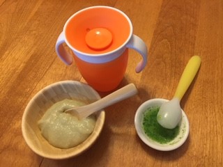 今日は夫が休みで家にいたので、夫に離乳食あげてもらいました。