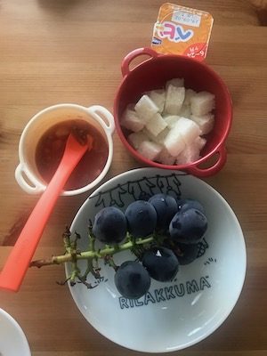 夜ご飯のズッキーニは咀嚼が大変そうでズッキーニのみ少し残し。ズッキーニを口に運ぶと難しい顔をしながら一生懸命カミカミしていました。早く歯が生えるといいね・・・。