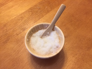 お粥は今だに10倍粥を作っていますが、気持ち粗目のお米の粒が分かる程度に作るようにしました。問題なく食べてくれます。
