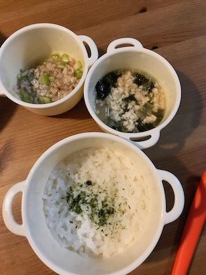 E:小松菜・玉ねぎをごま油(小さじ1)でしんなりするまで炒める。水をひたひたになるように注ぎ、グツグツ煮込む。煮込んでいる間に鶏むねミンチに片栗粉を適量混ぜてこねて団子を作る。グツグツしているところに団子を入れて蓋をしてグツグツ煮込む(合計30分くらい煮込む、鶏団子に火が通っているか要確認)。途中水が少なくなったら具材浸る程度まで足す。塩小さじ1で味付け。離乳食用は具材を刻んで汁をかける。