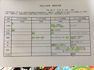 昨日の保育園の入園説明会でもらった食材と月齢のアレルギー表