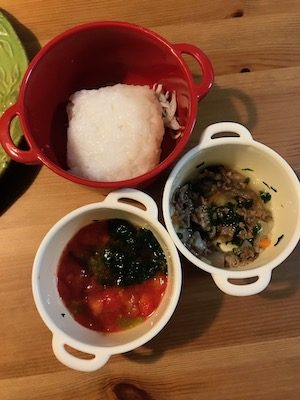 E:ヨコワ(刺身冷凍ストック)と茹でモロヘイヤ(冷凍ストック)、かつおだし(冷凍ストック)を容器に入れてレンジで加熱解凍する。大人用に茹でたそうめんの一部をさらに3分ほど茹でてカットして容器で合わせる。醤油2滴くらい入れる。