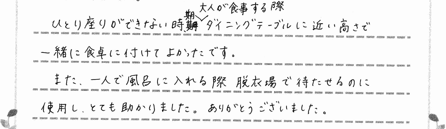 ひとり座りができない時期、大人が食事する際ダイニングテーブルに近い高さで一緒に食卓に付けてよかったです。また、一人で風呂に入れる際、脱衣場で待たせるのに使用し、とても助かりました。ありがとうございました。