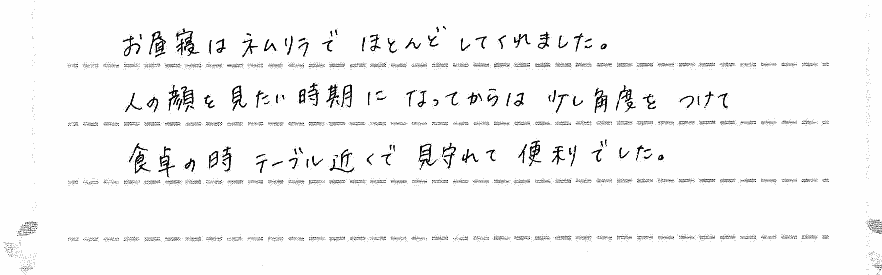 お昼寝はネムリラでほとんどしてくれました。人の顔を見たい時期になってからは少し角度をつけて食卓の時テーブル近くで見守れて便利でした。