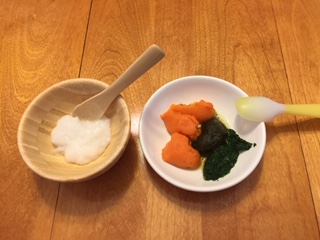 小松菜はやはり少し苦みが強いのか、まだ好きじゃないようなので、チャイニーズケールとにんじんとさつまいものピューレの混ぜて与える作戦。