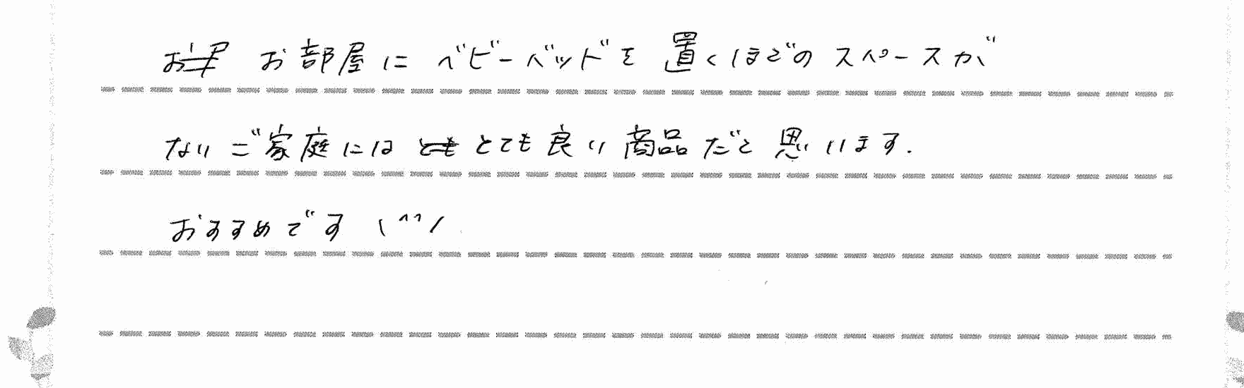 初めての子育てで布団1つ選ぶのも悩みましたが、このレンタルベッドだけで安心して寝かせることができました。持ち運びもしやすく、里帰り先から帰宅する時も赤ちゃんの居場所をすぐ作ることができて良かったです。ありがとうございました。