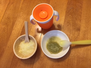 とろみをつけるとやはり食べてくれる確率がぐんとあがります。片栗粉を使う手もありますが、できるだけ新鮮な食材を使って離乳食作りたいので、お粥、じゃがいも、さつまいも、などデンプン質の多いものを混ぜる。