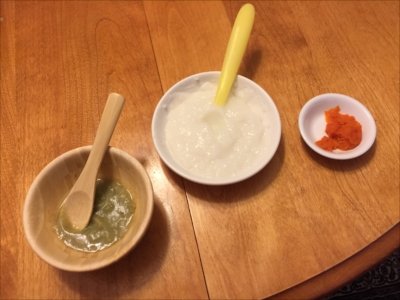 お粥に混ぜて少しだけ食べさせました。お粥とリークスープは問題なく食べてくれます。