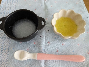 おかゆは最初より少しだけ、水分を控えめにしだしています。ぽってりとトロトロの間くらいかな?今のところうまくごっくんできてるので、とりあえずこのくらいで様子見します。