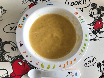 今日はいつもよりも果物の量と種類を増やして、ランチの野菜とは別にフルーツミックスを朝食としてあげました。ここスペインでは、このように数種類の果物を合わせたスムージーのようなものを離乳食としてあげるのが主流です。野菜を始める前からフルーツミックスをあげることも多いです。時にはビスケットや乳児用のシリアルを混ぜることもあります。