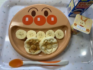 朝食 アンパンマンのパンケーキ、バナナ、ヨーグルト、スポロン