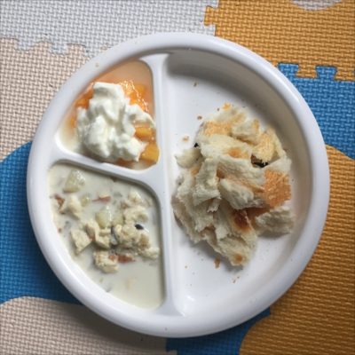 食パンは耳を取り除き、白いところを細かくちぎっておき、お野菜のスープなどを軽くかけて少しふやかすと、手づかみで食べてくれます。