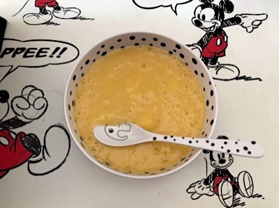 早朝からぐずっていたぺピート。ミルクをあげてもそれほど飲まず、眠そうなのでベッドに寝かせても泣いて眠りません。そこで、朝ごはんにまたフルーツミックスをあげてみました。すると、ミルクはそれほど飲まかったのでお腹は空いていないと思っていたのですが、フルーツミックスはパクパクと食べます。あっという間に完食です。フルーツミックスでお腹が一杯になったら、すぐにコテンと眠りました。