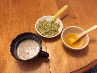 シリアルは朝ごはんの残りです。朝は多めに作って、あまりをお昼に回しています。その時によって朝は食べムラがあるのですが、よく食べる日は、おかわりを作りに行くと泣くのですよね。なので、多めに。ちなみに息子くん3回食を始めてから、2‐3日に一度しか便をせず、ちょっと便秘気味です。なのでシリアルなどは写真のように水分多めのゆるゆるで作っています。