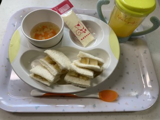朝食 バナナサンドイッチ、きゅうりと人参のスープ、チーズ,オレンジジュース