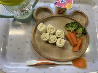 まだ、なかなか手掴み食べが上達しないので時々取って口に入れてあげています。