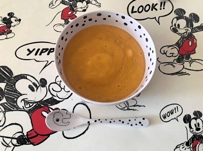 材料を全て鍋で煮て、野菜が柔らかくなったら火を止め、オリーブオイルを加えてハンドブレンダーでピュレにしました。今日は離乳食の水分量を少し増やして食べやすくし、量を多めにあげました。