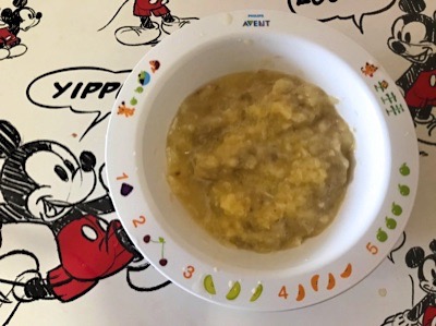 いつもはハンドブレンダーでピュレ状にしますが、今日はバナナをフォークで粗めにつぶし、りんごはすりおろして、みかんの絞り汁と共にバナナに加えて混ぜ合わせました。ぺピートがもぐもぐできるように、少し歯応えを残しましたが、食べてくれるでしょうか。