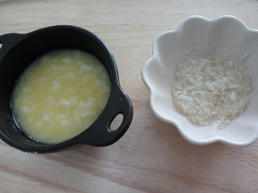 さて、ささみはパサパサしているので、とろみをつけておきます。もちろんじゃがいもやおかゆと混ぜて食べやすくしてもよいのですが、今回は初回ということで片栗粉を使用。少しとろみが強くなってしまいましたが、問題なく食べてくれました。