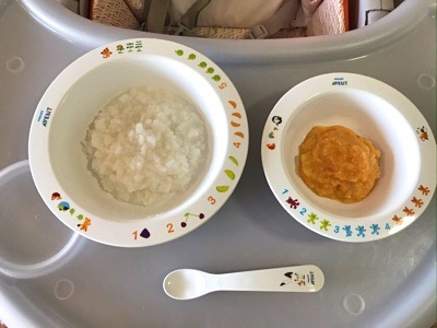 お粥は、何これ?とでも言うように、顔をしかめながら食べていました。いくらかは食べましたが、口から出したりしながらあまり進んで食べなかったので、無理にあげないことにしました。野菜とお肉のピュレもあまり食べません。両方とも1/3くらい食べて終わりました。