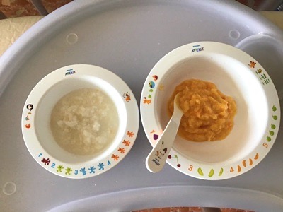 昨日と同じです。歯応えを残したピュレもお粥も昨日はだいぶ残したので、今日はもう一度同じメニューをあげてみることにしました。やはり、両方ともあまり食べません。まず口に入れると渋い顔をして、一応モグモグしてから飲み込むのですが、「ヤ、ヤ、ヤ、ヤ、ヤ」などと声を出しながら手をバタバタさせて騒ぎ始めます。両方の手で自分の顔を挟んでイヤイヤするので、可笑しくて笑ってしまいます。1/3くらいずつ食べ終わったところで、口を開けなくなったのでお食事は終了にしました。