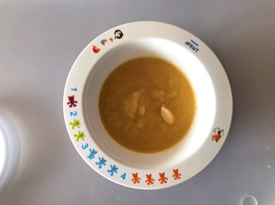 そのため、今日からペピートの離乳食にも茹で卵の黄身を少しずつ混ぜることにしました。にんじんと皮を剥いたズッキーニを柔らかくなるまで茹でて、余分な水分を捨てオリーブオイルを加えてハンドブレンダーでピュレにします。そこに、茹で卵の黄身を1/8くらい加えました。野菜のピュレを全て食べない可能性があったので、黄味は全体に混ぜずに、一部にだけ混ぜました。