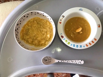 今日は昨日よりも茹で卵の黄身の量を少し増やしてピュレに混ぜました。ピュレの作り方は、野菜を柔らかくなるまで茹でたら、余分な水分を捨ててオリーブオイルを加え、ハンドブレンダーでピュレにしたらできあがりです。スイートポテトとは、ここスペインで「ボニアト」や「バタタ」と呼ばれるサツマイモのような甘いお芋です。形はサツマイモに似ているのですが、色はオレンジ色でにんじんのような色をしており、味もにんじんに似ていると思います。にんじんやジャガイモよりも柔らかく火の通りがはやいです。
