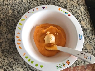 1時間後くらいに野菜のピュレのみをまた食べさせました。今度は騒がずに嫌がることなく全部食べました。