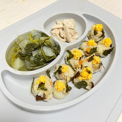 けーちゃんも男の子ですがひなまつりを味わってもらうべく、ちらしおにぎりを作りました!