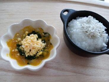 ・かぼちゃ・小松菜・たまねぎ・卵のだし和え 小さじ2・1・1、卵黄・白 ◎