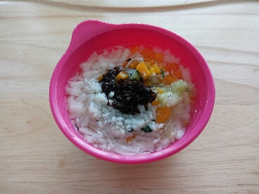 野菜やうどんと混ぜながら食べさせましたが、全然問題なく食べてくれました。ひじきは鉄分が多めなので、食べてくれると助かるなあ。