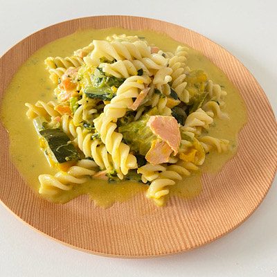 前日のサーモンの残りと、かぼちゃ、ブロッコリースプラウト、ほうれん草。それにパスタを入れて牛乳を加えて、全部