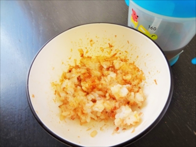 鰹節が安かったので、お醤油で少し味付けしておかかごはんにしました。大好きな納豆ご飯に比べると、ツルッと感が少ないせいかあまり進まず。味は嫌いでない様子でしたが、食べづらそうにしていました。